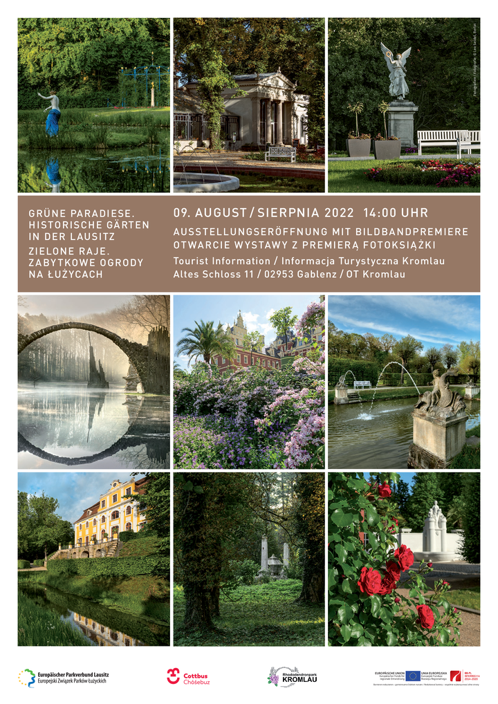 die Stadt Cottbus in Kooperation mit der Tourist Information Kromlau und der Gemeinde Gablenz-Kromlau lädt Sie herzlich zur Teilnahme an dem deutsch-polnischen Event des EPVL Ausstellungseröffnung „Grüne Paradiese. Historische Gärten in der Lausitz“ mit Bildbandpremiere ein.
